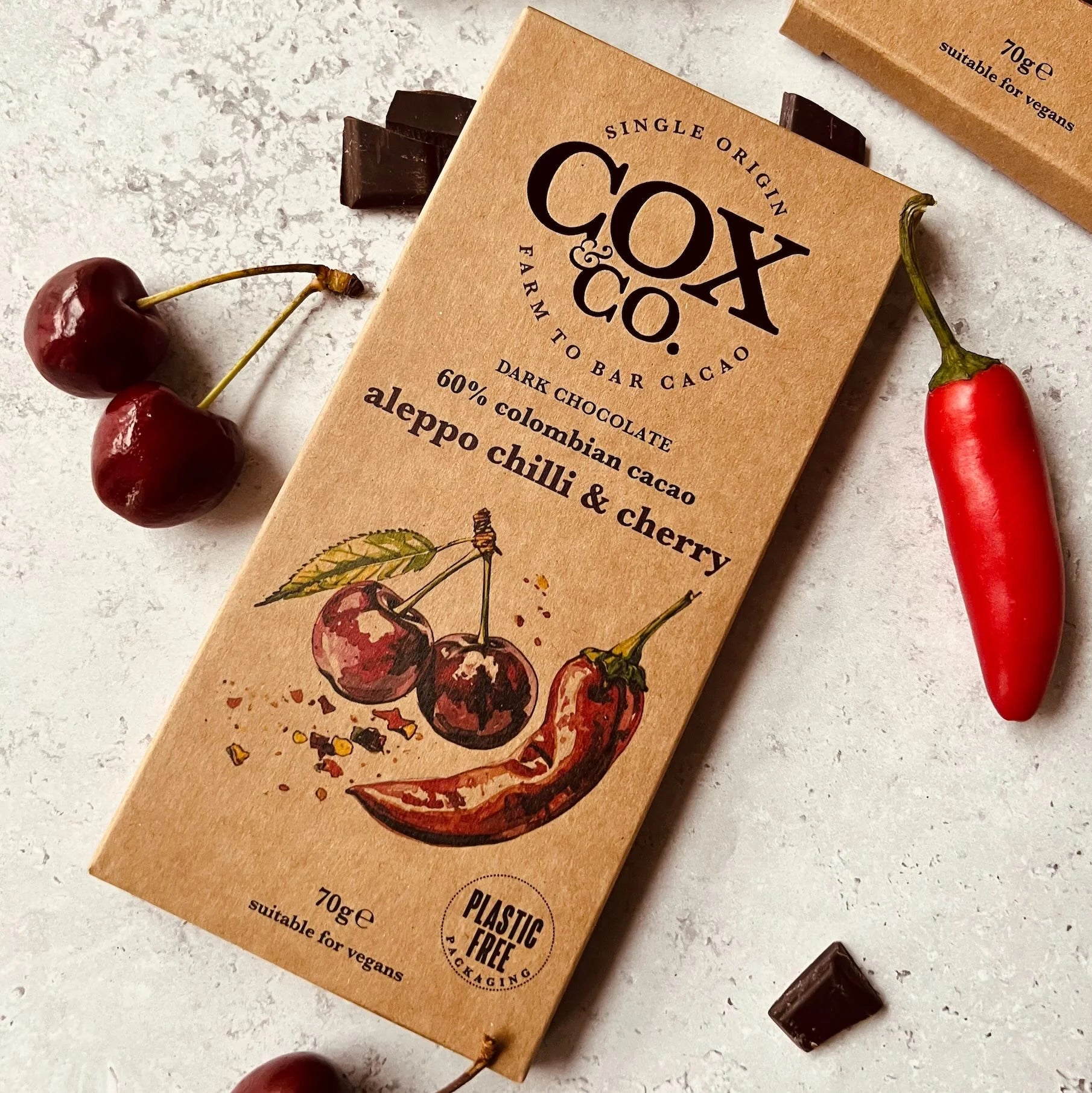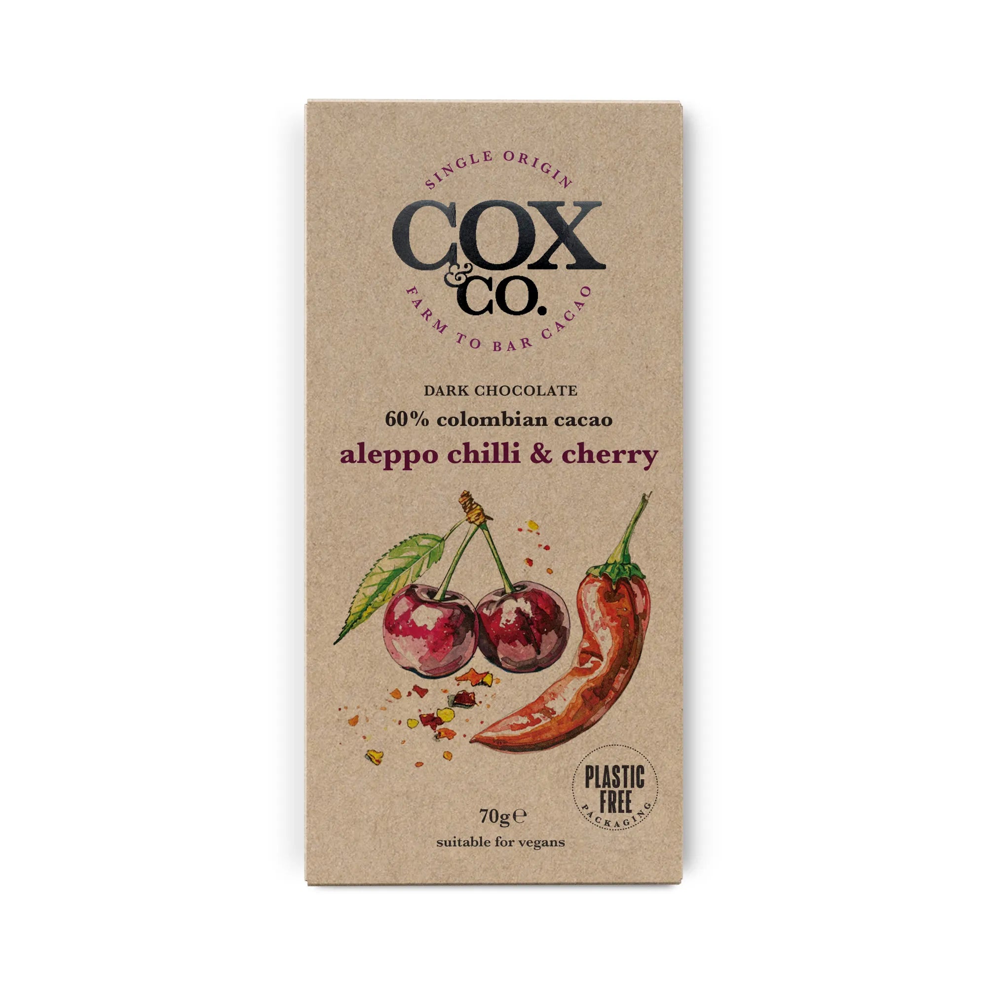 Colombian Dark Chocolate (96%) (cocoa mass, sugar, cocoa butter, emulsifier: SOYA lecithin; vanilla extract), Sour Cherry Granulates (3%) (glucose syrup, sour cherry, sugar, modified starch: potato; sodium alginate), Aleppo Chilli Flakes (<1%) (red pepper flakes, salt, sunflower oil), Natural Flavouring (<1%). Dark Chocolate contains cocoa solids 60% minimum.