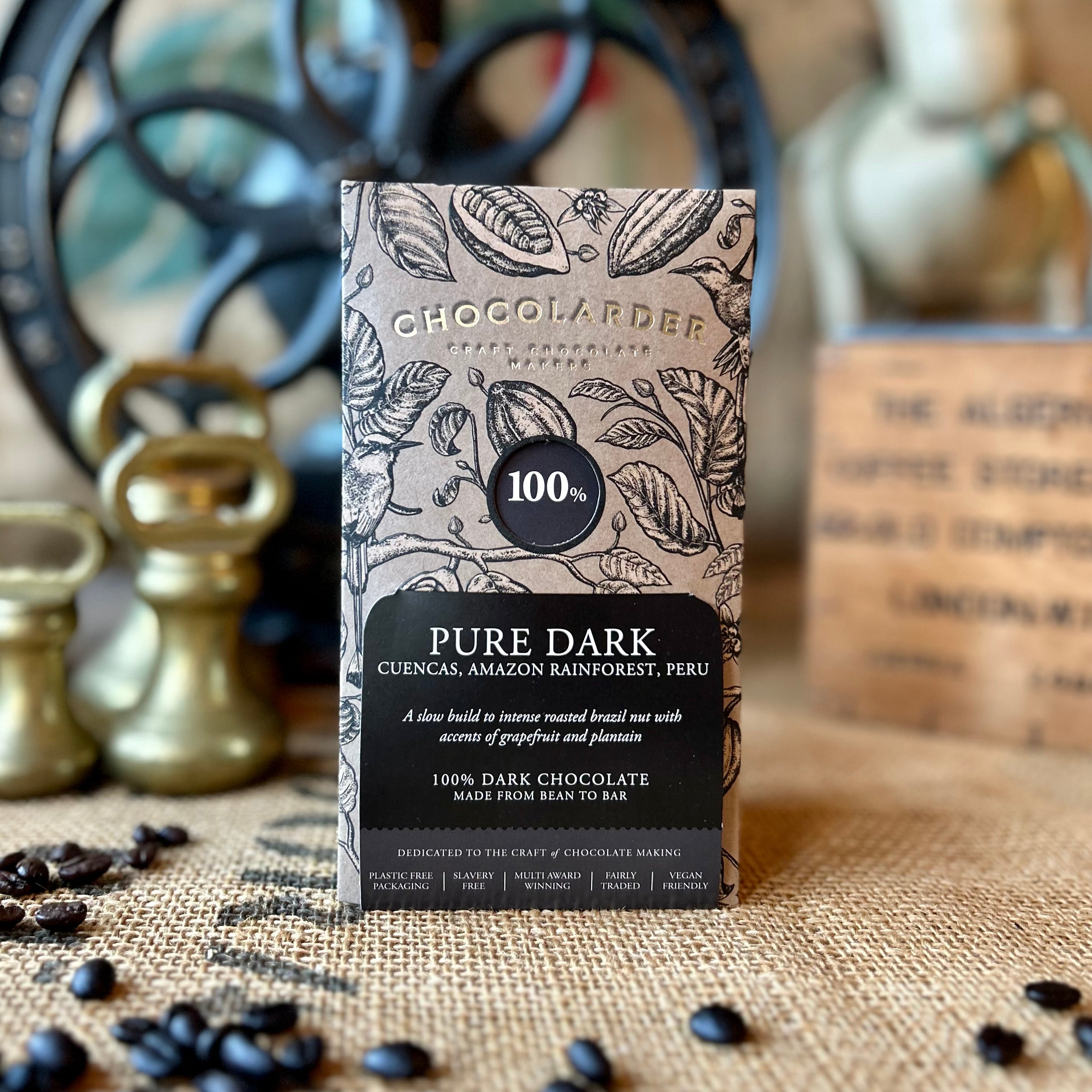 Crafted bean to bar by a skilled chocolate maker, the natural sweetness and flavour are carefully developed through every stage of the process. The result is a beautifully balanced 100% bar, with a slow build of roasted Brazil nut, lifted by notes of grapefruit and plantain.